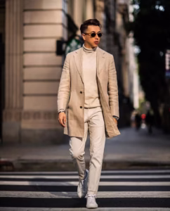 This dapper man’s outfit shows just how powerful monochrome style can be. The light beige overcoat works perfectly with the matching turtleneck and slim-fit trousers, creating a clean and put-together silhouette.