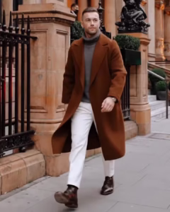 This look is perfectly balanced, with warmth and sophistication for the colder months. The rich brown overcoat makes a bold statement, while the charcoal turtleneck underneath adds a touch of refined comfort.