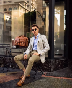 This dapper man’s outfit combines classic tailoring with effortless sophistication. The light checkered blazer pairs seamlessly with a crisp blue shirt, creating a sharp and polished upper half.