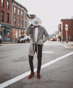 This dapper man’s outfit strikes the perfect balance between rugged charm and refined sophistication.