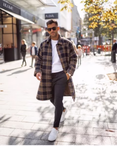 The long plaid overcoat in blue and brown tones adds depth and structure, while the crisp white tee keeps the look fresh and uncomplicated.