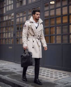This dapper man’s outfit shows just how powerful monochrome style can be. The light beige overcoat works perfectly with the matching turtleneck and slim-fit trousers, creating a clean and put-together silhouette.